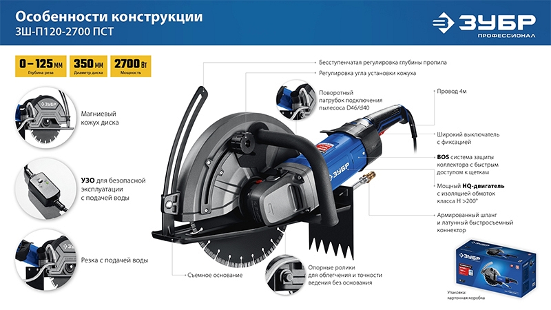 Преимущества электрического резчика по бетону Зубр Профессионал ЗШ-П120-2700 ПСТ: