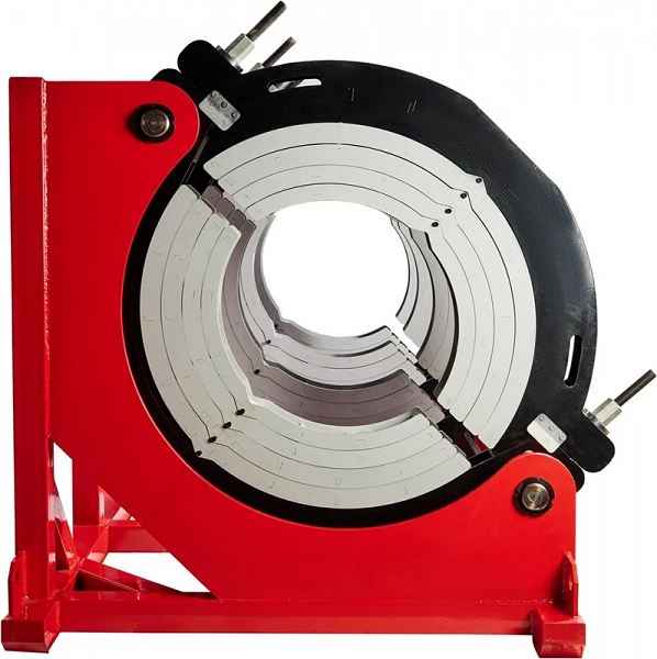 - Центраторо с гидравлическим приводом и 4-мя прочными широкими зажимами, один из которых легко может быть удален для облегчения сварки полимерных фитингов с трубами (тройники, крестовины, отводы), имеет большой запас прочности за счет качественного сплава и ребер жесткости, что позволяет сваривать полимерные трубы с любым показателем SDR