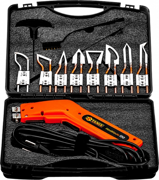 Термонож с фигурными лезвиями Stanix HotBlade Shapes (ХотБлейд Шейпс) – электрический нож с фигурными лезвиями тип A, B, C, D, E, F, G, R из хромоникелевой стали для беспыльной термической резки элементов из полимеров: полипропилена, ПВХ, полиэтилена и стиродура, полиуретана, пенополистирол (EPS) и экструдированного полистирола (XPS), картона, резины и многого другого в строительных компаниях и курьерских службах, рекламной индустрии, сфере торговли, швейной, автомобильной и электротехнической промышленности, а также в мебельном производстве и архитектурном моделировании, подходит для внутренних и наружных работ, безотходной резки, моделирования, строжки и обрезки теплоизоляционных материалов, идеально подходит для резки изоляционных плит, формирования пазов для электрических или сантехнических установок, с легкостью прорезает пенокартон, пенополистирол, пластиковую упаковку, резину и многие другие материалы, с которыми не справляется обычный нож.